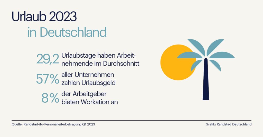 Tipp – Wer noch zögert und nichts gebucht hat: 61% der Unternehmen geben in der Randstad-ifo-Personalleiterbefragung an, dass sie es ihren Mitarbeitenden ermöglichen, den Urlaub flexibel einzureichen. Und wenn es am Ende doch nicht mit dem Urlaub klappt? In 24% der Unternehmen können sich Mitarbeitende den Urlaub auszahlen lassen. Und für ein bisschen Urlaubsfeeling in der kälteren Jahreszeit gibt es eine weitere Möglichkeit: Fast jedes zehnte Unternehmen bietet Workation an (8%).