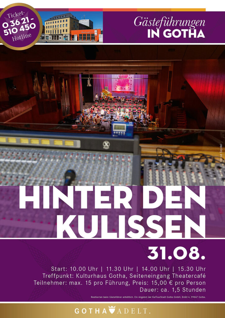 Ursprünglich als Kino gebaut und 1940 eröffnet, begann 1973 mit neuem Bühnenhaus, Theatercafé und modernisiertem Innenausbau die Glanzzeit des Hauses als „Kreiskulturhaus“. 1990 – nun als Eigentum der Stadt Gotha – erfolgte die Umbenennung in „Gothaer Kulturhaus“. Die Gästeführungen am 31. August ermöglichen den seltenen Blick hinter die Kulissen dieses besonderen Veranstaltungsortes, der noch immer im Retro-Flair der Siebziger Jahre erstrahlt. Hierbei dürfen die Gäste die Theaterbühne mit Drehbühne sowie die Licht- und Tontechnik aus unbekannten Perspektiven erkunden, die den Zuschauern bei einem regulären Besuch verborgen bleiben.