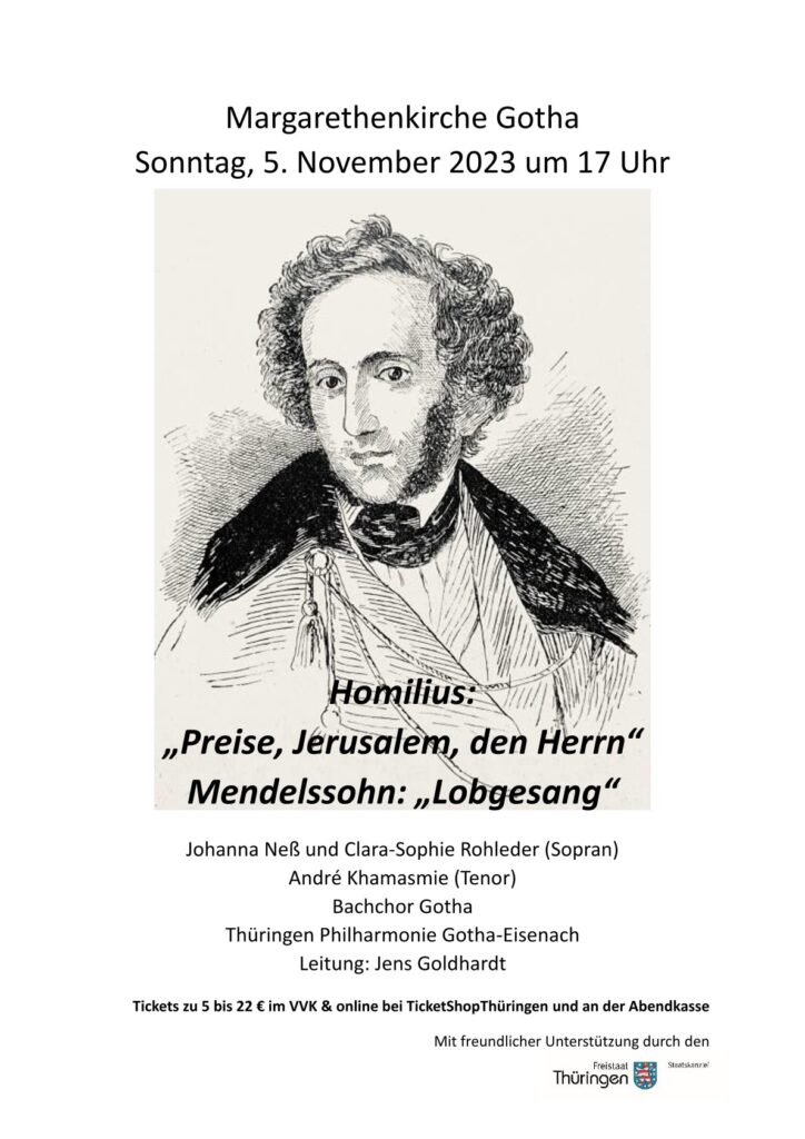 Die Sinfonie-Kantate „Lobgesang“ gehört zu den schönsten Kompositionen Mendelssohns. Ihre Entstehung verdankt sie einer Gedenkfeier anlässlich der vierhundertjährigen Entstehung des Buchdrucks mit beweglichen Lettern im Jahre 1840 in Leipzig. Nach drei Instrumentalsätzen folgen neun Abschnitte, in die Sopran- und Tenorsolo sowie Chor einbezogen werden. Am Sonntag, dem 5. November 2023 ist diese Musik um 17 Uhr in der Margarethenkirche zu hören. Der Bachchor Gotha und die Thüringen Philharmonie Gotha-Eisenach musizieren gemeinsam mit Johanna Neß (Sopran) und André Khamasmie (Tenor). Eröffnet wird das Konzert mit einer kleinen Kantate zum Reformationsfest aus der Feder des Bach-Schülers Gottfried August Homilius. In beiden Stücken beleuchten biblische Texte die Frage, wie es uns gelingen kann, in dunklen Zeiten das Tröstende, Helle zu finden und Finsternis in Licht zu verwandeln. Eine Frage, auf die wunderbare Klänge eine Antwort erahnen lassen.