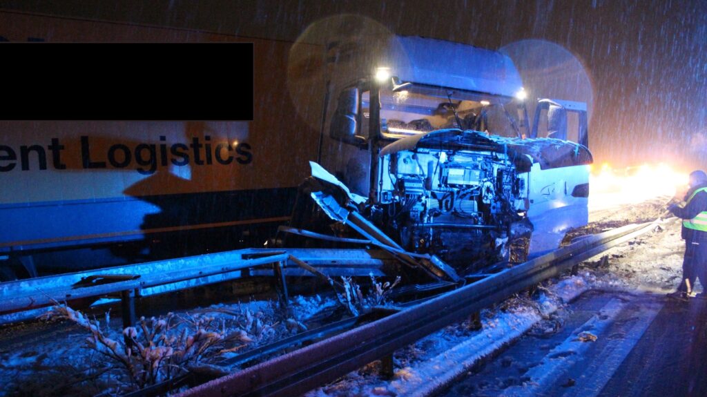 In den frühen Morgenstunden des heutigen Tages kam es auf der A9 zwischen den Anschlussstellen Bad Lobenstein und Schleiz in Fahrtrichtung Berlin zu einem schweren LKW-Unfall. Ein 56-jähriger Tunesier kam mit seinem Sattelzug vom mittleren Fahrstreifen nach rechts ab und kollidierte mit einem dort fahrenden Schwerlasttransport (SLT). Aufgrund des Zusammenstoßes verließ der SLT seinen Fahrstreifen und fuhr in die rechte Leitplanke. Der Unfallverursacher kam nach links ab und kollidierte mit der Mittelleitplanke. Dabei verkeilte sich das Fahrzeug in der Schutzplanke und verschob diese in den Gegenverkehr. Nach bisherigen Erkenntnissen ist die Unfallursache auf eine deutlich zu schnelle und den Witterungsverhältnissen unangepasste Fahrweise zurückzuführen. Es entstand ein Gesamtschaden von etwa 85.000 EUR. Personen wurden nicht verletzt. Beide Richtungsfahrbahnen mussten für ca. zwei Stunden voll gesperrt werden.