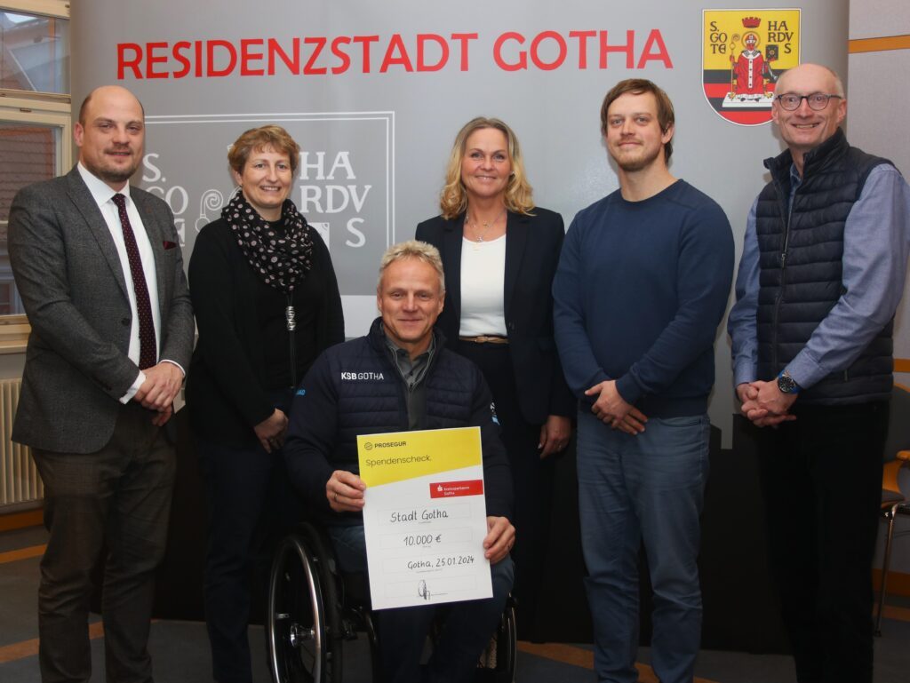 Am 25. Januar 2024 übergaben der Vorstandsvorsitzende der Kreissparkasse Gotha, Jörg Krieglstein und Grit Georgi von der Firma Prosegur der Stadtverwaltung Gotha eine Spende in Höhe von 10.000 Euro an den Beigeordneten der Stadt Gotha, Peter Leisner.