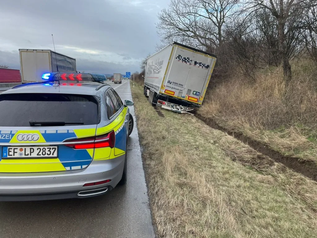 Sattelzug fährt auf der A 4 bei Erfurt in den Straßengraben