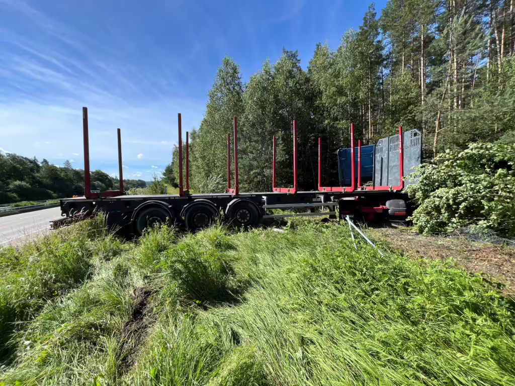 Heute Vormittag erreichte die Autobahnpolizei die Mitteilung über einen Verkehrsunfall auf der A9 in Fahrtrichtung München. Kurz nach der Anschlussstelle Hermsdorf-Süd fuhr ein Holz-Laster eine Böschung neben der Autobahn hinauf. Nach ersten Erkenntnissen geriet das Fahrzeug nach dem Überholvorgang ins Schleudern, wodurch der 27-jährige deutsche Fahrer die Kontrolle über den Lkw verlor. In der weiteren Folge kam er nach rechts von der Fahrbahn ab, fuhr den Grünstreifen neben der Autobahn entlang und durchbrach einen Wildschutzzaun. Schließlich kam das Gespann in einer Böschung zum Stehen.