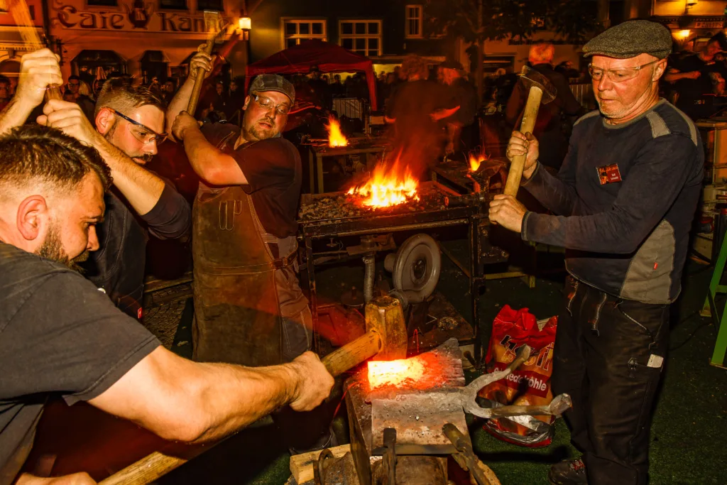 Der Buttermarkt ist nach wie vor das Zentrum für die Schmiedinnen und Schmiede. Dort stehen die Schmiedefeuer, dort wird gehämmert, geschweißt und gestaltet. Eine besondere Attraktion ist das Nachtglühen am Samstagabend. Da zeigen die Akteure, wie schön und aufregend das gemeinsame Schmieden sein kann. Dass dabei kräftig die Funken fliegen und auch sonst manche Lustigkeit zu sehen ist, versteht sich von selbst.