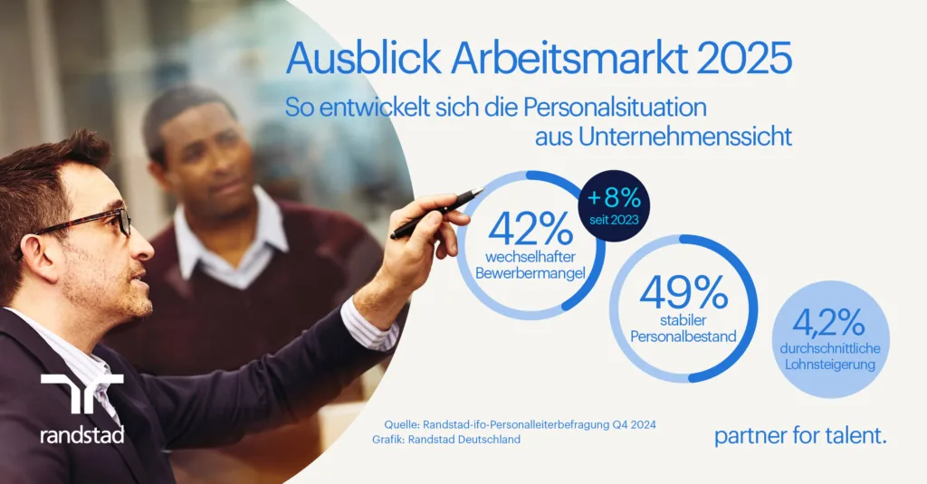 Neues Jahr, neuer Arbeitsmarkt: Deutsche Unternehmen reagieren auf die veränderten wirtschaftlichen Aussichten und stellen sich personell für 2025 auf. Einerseits werden in einigen Unternehmen Stellenreduzierungen angekündigt, gleichzeitig bleibt der Fachkräftemangel ein bestimmendes Thema. Insgesamt wird die Situation auf dem Arbeitsmarkt zunehmend differenziert wahrgenommen. Das zeigt die Randstad-ifo-Personalleiterbefragung Q4 2024.