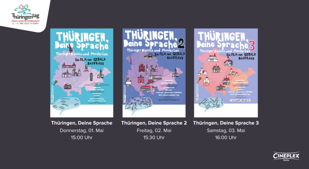 Für Film- und Kulturbegeisterte bietet das Cineplex Gotha mit dieser Filmreihe eine besondere Gelegenheit, die sprachliche Vielfalt Thüringens zu entdecken und mit dem Regisseur persönlich ins Gespräch zu kommen.Tickets zu den drei Filmen – die unabhängig voneinander funktionieren – erhalten Sie an der Kinokasse oder auf unserer Website unter: https://www.cineplex.de/filmreihe/thueringentag-2025/5237/gotha/