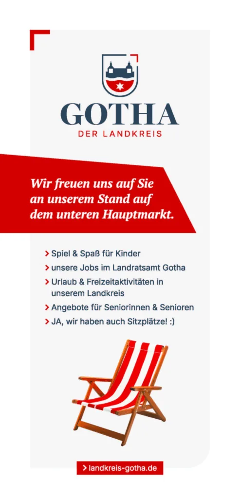 Mit einem 75 m² großen Stand stellt sich der Landkreis Gotha auf der Finanzmeile zum Thüringentag vor. Vom 2. bis zum 4. Mai entdecken Besucher:innen den Landkreis als Urlaubs- und Wirtschaftsregion sowie als einen der größten Arbeitgeber in der Umgebung. Heißt: In entspannter Atmosphäre mit Liegestühlen und Palmen gibt es Tipps rund um Urlaub, Camping und Ausflugsziele im Landkreis; Kolleg:innen des Personalamtes beraten zu Jobs und Ausbildungsmöglichkeiten im Landratsamt.