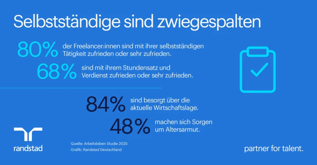 Viele Freelancer:innen sind selbständig aus Überzeugung, haben allerdings starke Sorgen mit Blick auf die generelle wirtschaftliche Situation – mit Auswirkungen für die eigene Auftragslage – und das Thema Altersarmut. Das geht aus den Ergebnissen der diesjährigen Randstad Arbeitsleben Studie hervor:
