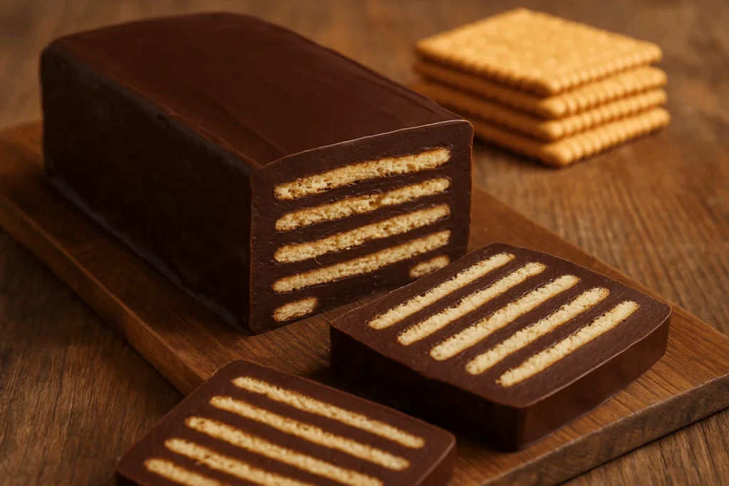 Der Name klingt kurios, doch das Prinzip ist einfach: Butterkekse werden abwechselnd mit einer dicken Schokocreme geschichtet. Diese besteht traditionell aus Kakaopulver, Kokosfett und Zucker, später kamen auch Butter und Schokolade dazu. Nach ein paar Stunden im Kühlschrank wird daraus ein fester Kuchenblock mit nostalgischem Biss.
