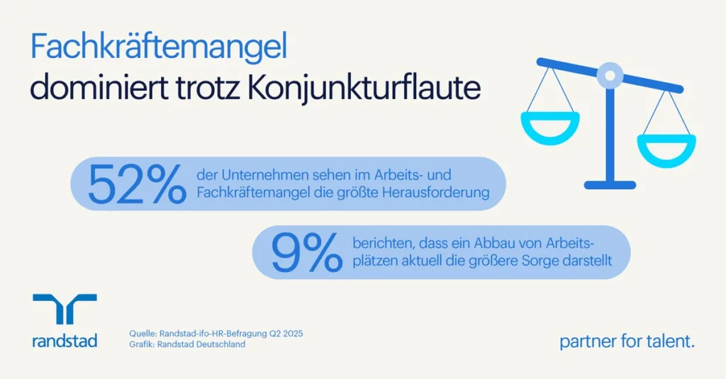 Die deutsche Konjunktur stagniert, doch der akute Mangel an Fach- und Arbeitskräften bleibt aus der Sicht der Wirtschaft mit Abstand die größte Herausforderung. Das zeigt die aktuelle Randstad-ifo-HR-Befragung für das zweite Quartal 2025: Für 52 % der befragten Unternehmen ist der Arbeits- und Fachkräftemangel derzeit relevanter als ein möglicher Stellenabbau. Nur 9 % berichten, dass ein Abbau von Arbeitsplätzen aktuell die größere Sorge darstellt.