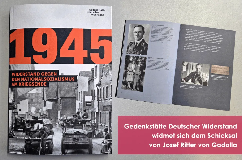 Die Gedenkstätte Deutscher Widerstand in der Bundeshauptstadt Berlin widmet sich noch bis zum 25. August 2025 in ihrer Ausstellung „1945 – Widerstand gegen den Nationalsozialismus am Kriegsende“ dem Geschehen in vierzehn deutschen Städten in den April- und Maitagen des letzten Kriegsjahres. Im ersten Kapitel des Ausstellungskataloges wird das Schicksal des Gothaer Standortältesten Oberstleutnant Josef Ritter von Gadolla dargestellt. Der Beitrag schildert die Versuche Gadollas die Stadt Gotha den Alliierten zu übergeben, seine Festnahme durch Wehrmachtsoldaten, seine Verurteilung zum Tode durch ein Standgericht der Wehrmacht in Weimar und die Rehabilitierung durch das Thüringer Oberlandesgericht 1997. Fotos und Dokumente stammen u.a. vom Stadtarchiv Gotha, der Friedenstein Stiftung Gotha, der Bundeswehr und dem Landesarchiv Thüringen – Staatsarchiv Gotha.