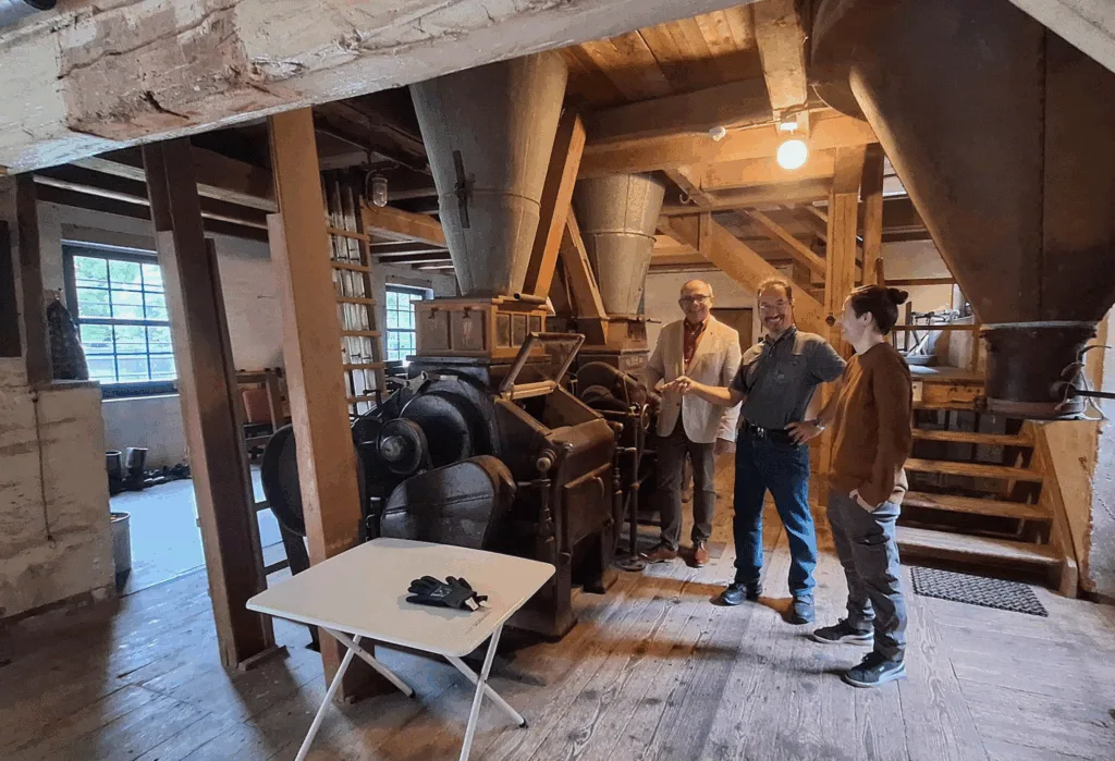 Oberbürgermeister Knut Kreuch besuchte gestern den ältesten Wirtschaftsbetrieb Gothas, die Kesselmühle. Diese hat eine über 675-jährige Geschichte und wurde 1349 erstmals urkundlich erwähnt. Nach der Belagerung der Stadt Gotha war sie zudem im Jahr 1567 auch Ort der Übergabe an den albertinischen Kurfürsten August von Sachsen. Nachdem die Mühle in Folge dessen niedergebrannt wurde, erfolgte sukzessive der Wiederbau an heutiger Stelle.
