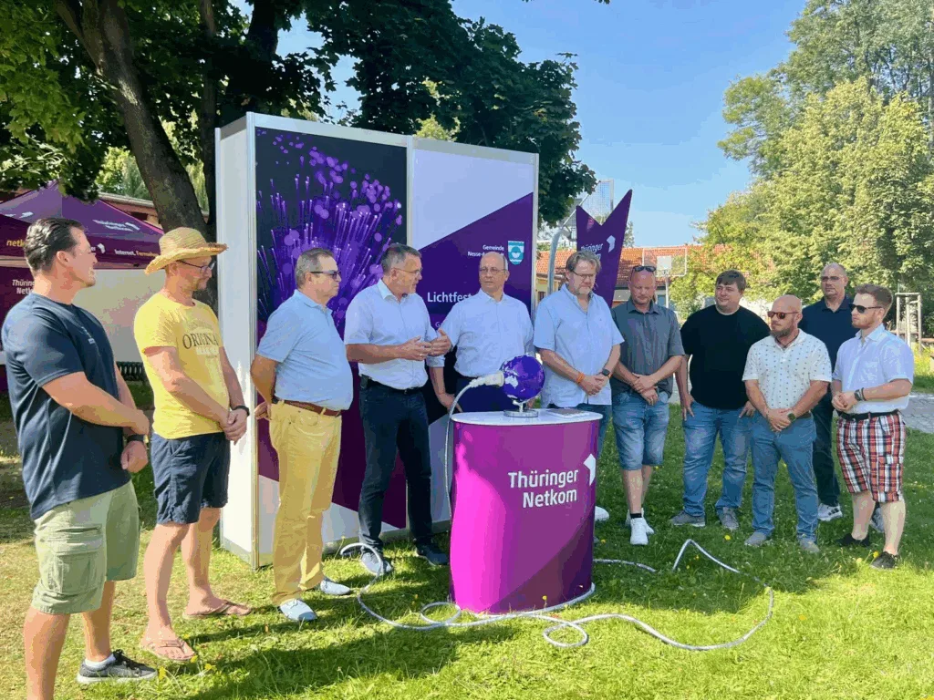 Gamstädt (13.08.2025). Mit einem symbolischen Lichtfest sind am Vormittag in Gamstädt die ersten Glasfaserdirektanschlüsse der Gemeinde Nesse-Apfelstädt freigeschaltet worden. Mehrere hundert Haushalte verfügen dort nun über leistungsfähige Glasfaseranschlüsse für Breitbandkommunikation mit Bandbreiten bis zu einem Gigabit pro Sekunde.