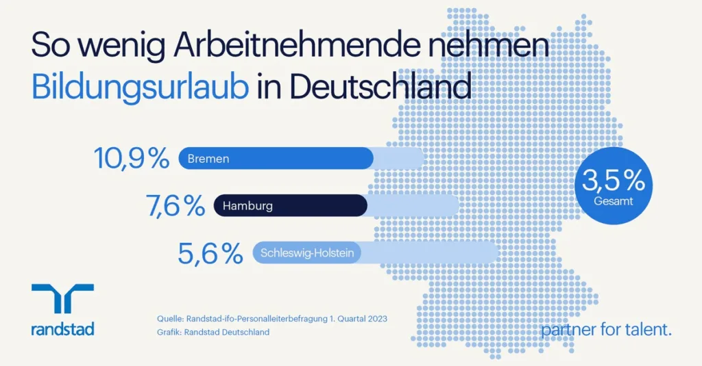Nur 3,5 Prozent der Beschäftigten in Deutschland nutzen ihr Recht auf Bildungsurlaub, obwohl 59 Prozent der Arbeitgeber diese Möglichkeit anbieten, zeigt die Randstad-ifo-HR-Befragung (1. Quartal 2023). Dabei bietet Bildungsurlaub Arbeitnehmer:innen die Gelegenheit, wertvolle Kompetenzen zu erwerben, ohne dafür reguläre Urlaubstage zu verbrauchen.