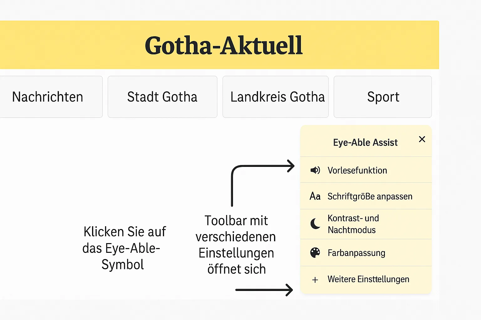 Gotha-Aktuell möchte allen Menschen den Zugang zu Nachrichten und Informationen erleichtern. Deshalb haben wir unsere Internetseite um ein neues Werkzeug erweitert: Eye-Able Assist. Dieses Barrierefreiheits-Tool sorgt dafür, dass unsere Inhalte für möglichst viele Menschen besser nutzbar sind – egal ob mit Sehschwäche, Leseschwierigkeiten oder individuellen Bedürfnissen bei der Bedienung.