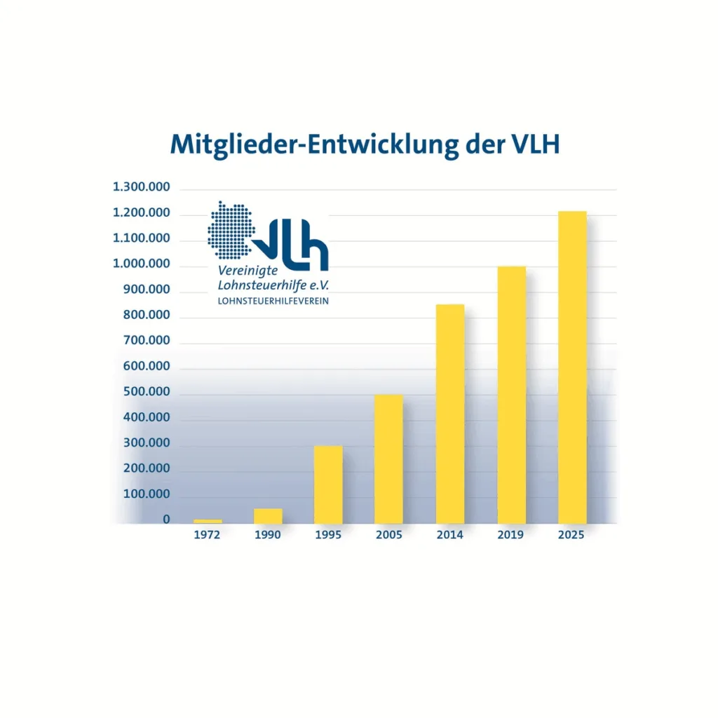 Im Jahr 1964 gab der Gesetzgeber grünes Licht für die Gründung von Lohnsteuerhilfevereinen. Damit sollte es Arbeitnehmerinnen und Arbeitnehmern ermöglicht werden, eine steuerliche Beratung zu vergleichsweise geringen Kosten zu erhalten. Der Lohnsteuerhilfeverein Vereinigte Lohnsteuerhilfe e. V. ging dann 1972 an den Start. Damit war der Grundstein für eine anhaltende Erfolgsgeschichte gelegt: Aus 50.000 Mitgliedern im Jahr 1990 wurden rund 500.000 im Jahr 2005. Weitere 100.000 kamen 2006 durch die Fusion mit der Lohnsteuerhilfe Ludwigshafen dazu. Das Netz an VLH-Beratungsstellen wurde flächendeckend und kontinuierlich ausgebaut: Heute stehen bundesweit rund 3.000 Beratungsstellen zur Verfügung, in denen mehr als 1,2 Millionen VLH-Mitglieder betreut werden – sowohl persönlich vor Ort oder auf Wunsch auf vollständig digital.