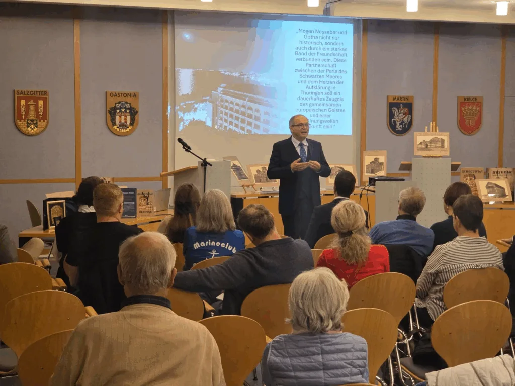 Oberbürgermeister Knut Kreuch, Stadtrat Tobias Meisel – Vorsitzender des Ausschusses für Bildung, Kultur, Jugend und Sport, Städträtin Christiane Kullmann – stellvertretende Ausschussvorsitzende, berichteten darüber hinaus von ihrer ersten Reise nach Nessebar und zeigten dabei einige fotografische Eindrücke. Tourismusattaché Dr. Tihomir Patarinski berichtete über eine künftige Verbesserung des Flugangeboten, womit Nessebar auch für die Gothaerinnen und Gothaer künftig noch schneller erreichbar wird.