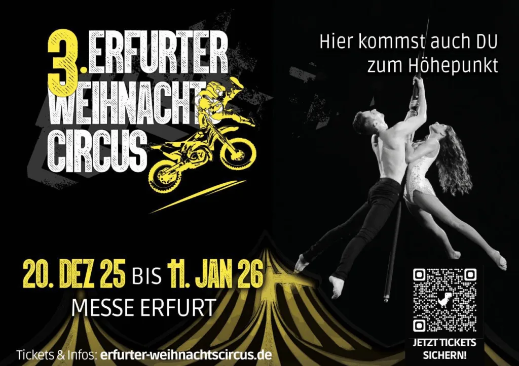 Erfurt. – Der beliebte Erfurter Weihnachtscircus kehrt in seiner dritten Auflage zurück auf das Messegelände der Landeshauptstadt. Vom 20. Dezember 2025 bis zum 12. Januar 2026 erwartet die Besucher eine faszinierende Show voller moderner Circuskunst, internationaler Spitzenartisten, mitreißender Comedy und atemberaubender Sensationen.
