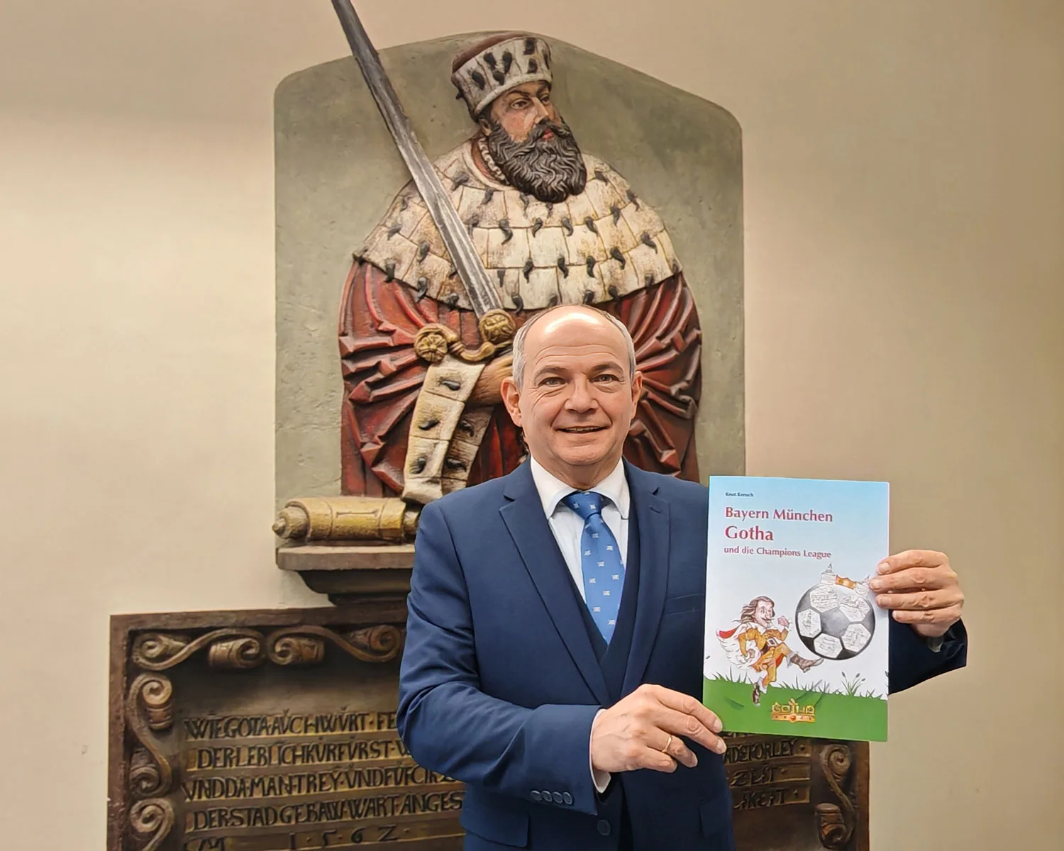 Gothas Oberbürgermeister Knut Kreuch hat zum Jahresende 2025 wieder eine kleine Geschichte vorgelegt. Nach dem großen Erfolg seiner vorjährigen Geschichte „Sissi, Gotha und die Windsors“ hat sich Kreuch in diesem Jahr an die Königsklasse gewagt. In seiner unnachahmlichen Art gelingt es ihm erneut, den besten Fußballclub Deutschlands in Beziehung zur Stadt Gotha zu setzen.
