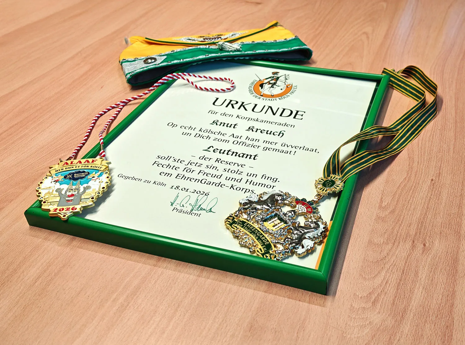 Urkunde für den Korpskameraden Knut Kreuch. Op echt kölsche Aat han mer üvverlaat, un Dich zom Offizier gemaat! Leutnant – der Reserve – soll`ste jetzt sin, stolz un fing. Fechte för Freud und Humor em EhrenGarde-Korps.“ Gegegeben zu Köln 18. 01. 2026 – Präsident.