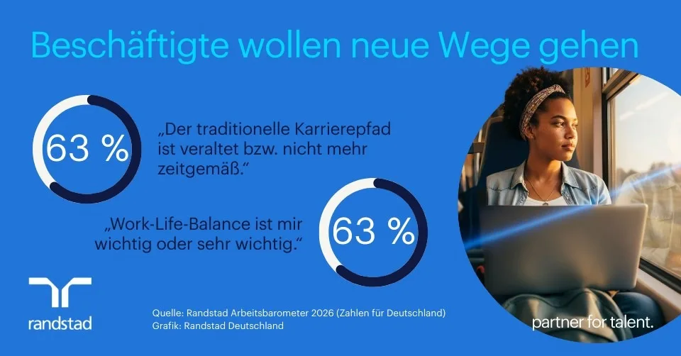 Hat der lineare Karriereweg – eine Karriere mit regelmäßigen Aufstiegsmöglichkeiten in einem oder mehreren Unternehmen – ausgedient? Darauf deuten die Ergebnisse des diesjährigen Randstad Arbeitsbarometers hin. Auch klassische Arbeitsmodelle werden durch Arbeitnehmende zunehmend hinterfragt.