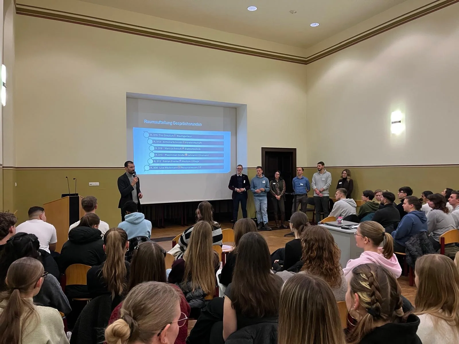 Sechs Ehemalige waren der Einladung gefolgt – trotz beruflicher Verpflichtungen. Die vertretenen Fachrichtungen reichten vom Bauingenieurwesen über die Forstwirtschaft bis zur Elektrotechnik sowie IT und Informatik. Offen berichteten sie über Studienalltag, Herausforderungen und persönliche Umwege.