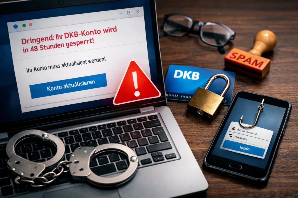 Am 12. Februar 2026 wurden erneut betrügerische E-Mails im Umlauf festgestellt, die sich gezielt an Kundinnen und Kunden der DKB richten. Der Betreff lautet meist: „Dringend: Ihr DKB-Konto wird in 48 Stunden gesperrt“. Ziel solcher Nachrichten ist es, Empfänger unter Druck zu setzen und zur Preisgabe sensibler Daten zu bewegen.