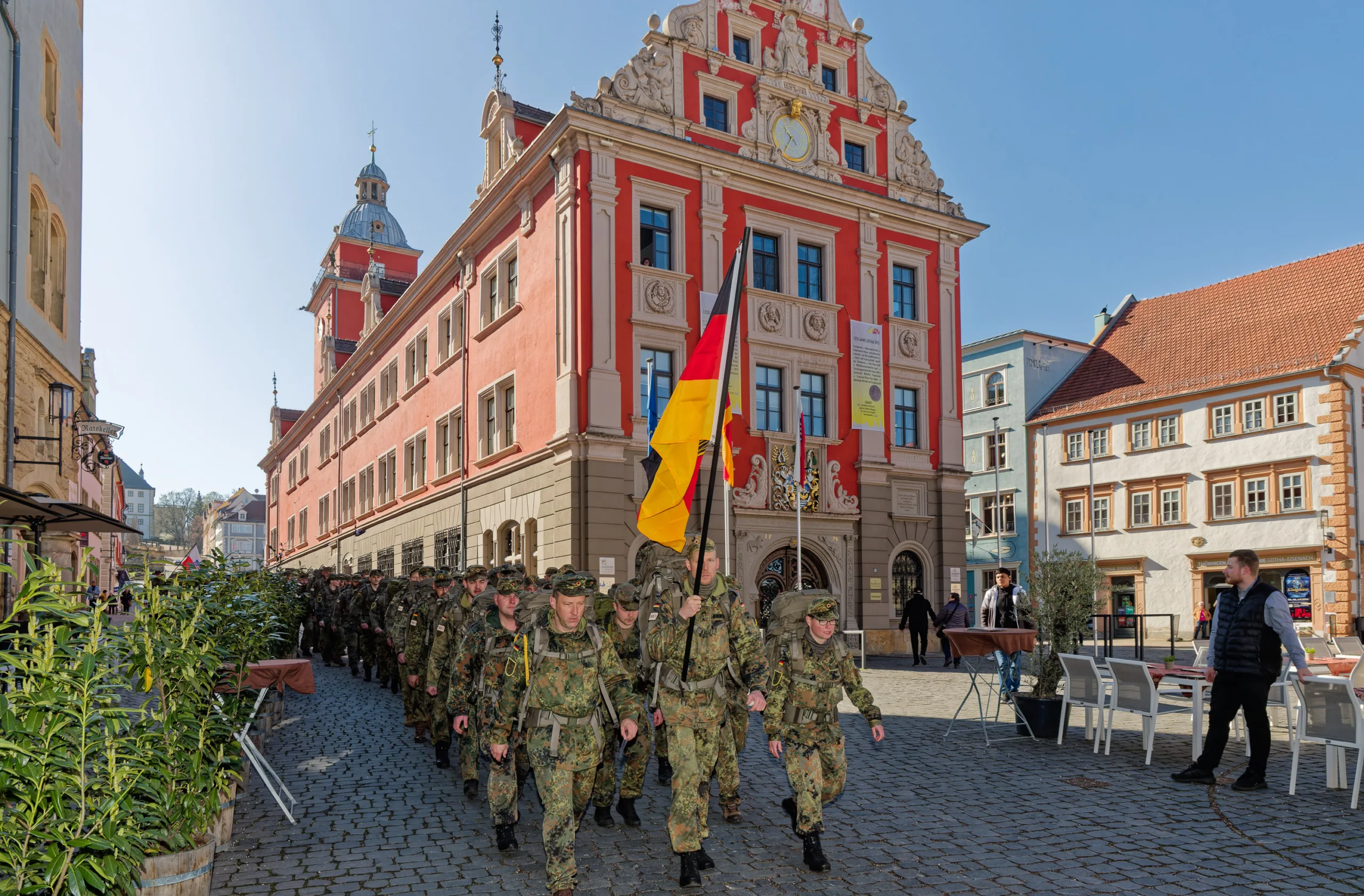 Vor 16 Jahren, am 2. April 2010, starben drei Soldaten bei ihrem militärischen Einsatz in Afghanistan. Seit dieser Zeit gibt es zu ihren Ehren den Gedenkmarsch des 3. Versorgungsbataillons 131, das in der Friedenstein-Kaserne in Gotha stationiert ist. Fast einhundert Soldatinnen und Soldaten machten beim diesjährigen 16K3-Marsch mit: Am 16. Jahrestag werden 16 Kilometer marschiert mit dem 16 Kilogramm schweren Rucksack. Nach einer Stärkung vor dem Schloss Friedenstein und den Gruppenfotos zur Erinnerung ging es mit strammem Schritt über den Hauptmarkt und Neumarkt zurück in die Kaserne. Major Ortega Osorio leitete den friedlichen Einsatz.