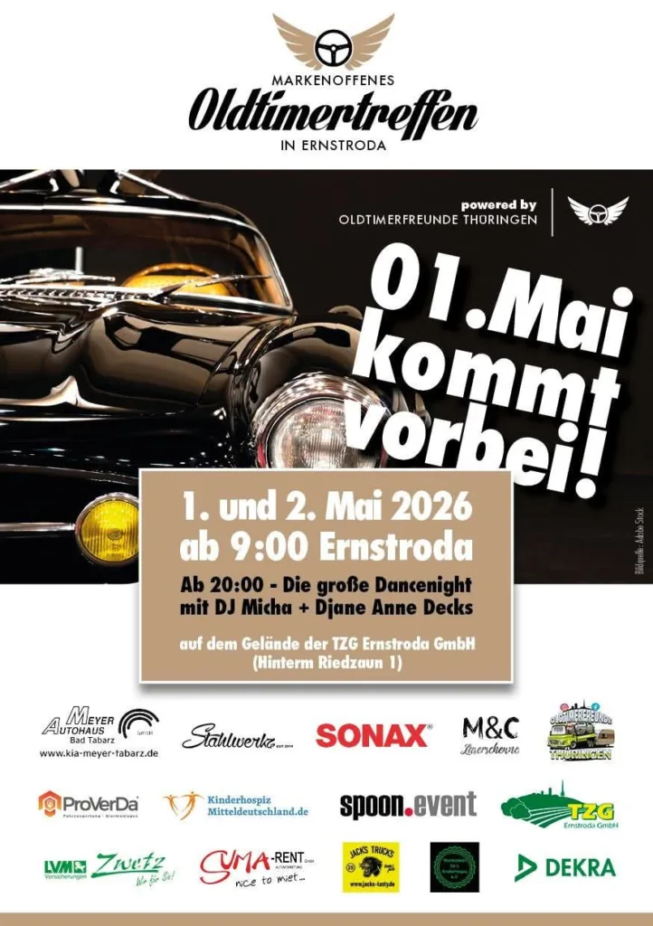 Am Freitag, den 01. Mai 2026 ab 09:00 wird das 3. Markenoffene Oldtimertreffen von den Oldtimerfreunden Thüringen präsentiert. Der Eintritt ist frei und für das leibliche Wohl wird bestens gesorgt. Auf dem Programm stehen um 14:15 Uhr ein Rundgang der Jury zur KFZ Bewertung, um 16:00 Uhr die Pokalvergabe und um 20:00 Uhr die große Dancenight mit DJ Micha und Djane Anne Decks. Auch am Samstag, den 02. Mai 2026 kann das Oldtimertreffen ab 09:00 Uhr besucht werden. Die Veranstaltung findet auf dem Gelände der TZG Ernstroda GmbH (Hinterm Riedzaun 1) statt.