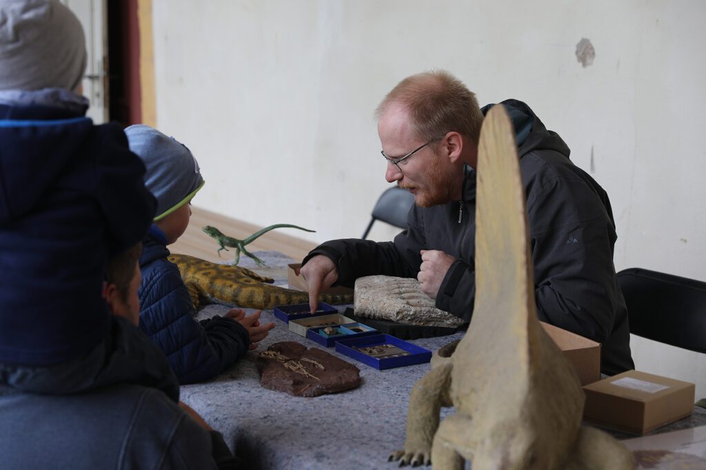 Geologie zum Anfassen, Graphiken zum Angucken: Nicht nur Fossilien aus verschiedenen Erdzeitaltern, sondern auch Wirbellose aus dem Schlossteich warten darauf, von den kleinen Forschern entdeckt zu werden. Die Kinder können naturwissenschaftliche Experimente durchführen, Trilobiten – also eine ausgestorbene Krebsart – basteln, sich schminken lassen oder beim Graffiti-Workshop zum Thema „Kinderrechte“ selbst kreativ werden. Die Mitarbeiter der Forschungsbibliothek zeigen, wie man mit wenigen Handgriffen ein eigenes kleines Heft herstellen kann.