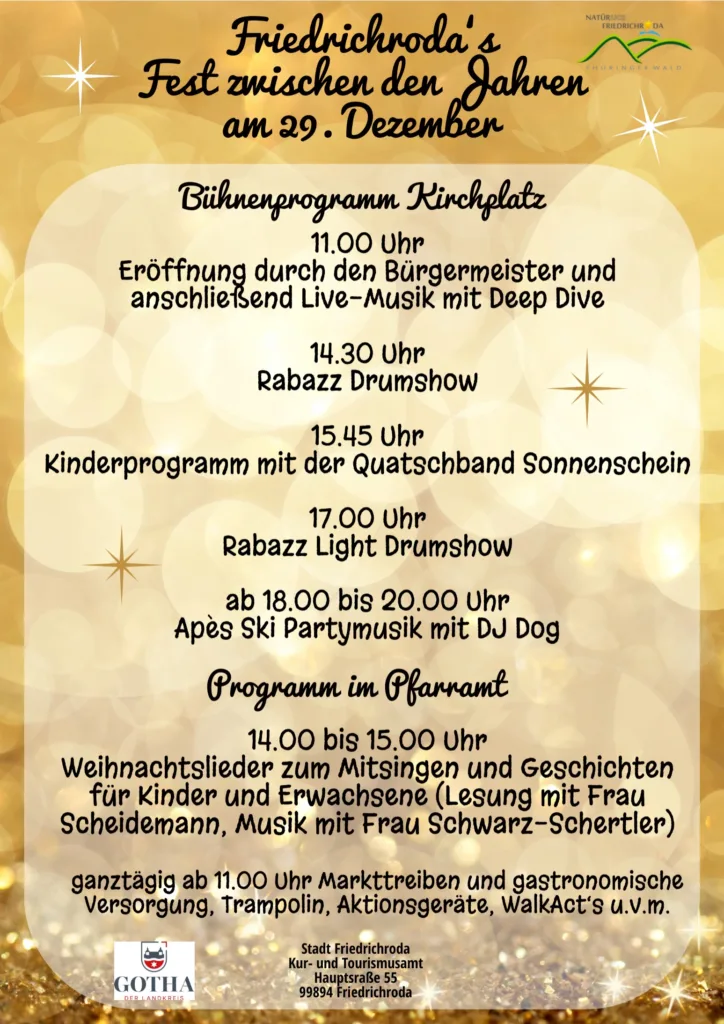 Das alljährliche „Fest zwischen den Jahren“ startet am Montag, den 29. Dezember 2025 um 11:00 Uhr mit der Eröffnung durch den Bürgermeister Kay Brückmann. Anschließend beginnt die Band „Deep Dive“ mit der musikalischen Unterhaltung. Außerdem steht um 14:30 Uhr die Rabazz Drumshow, um 15:45 Uhr das Kinderprogramm mit der Quatschband Sonnenschein, um 17:00 Uhr die Rabazz Light Drumshow und abschließend ab 18:00 Uhr die Après Ski Party mit „DJ Dog“ auf dem Programm.