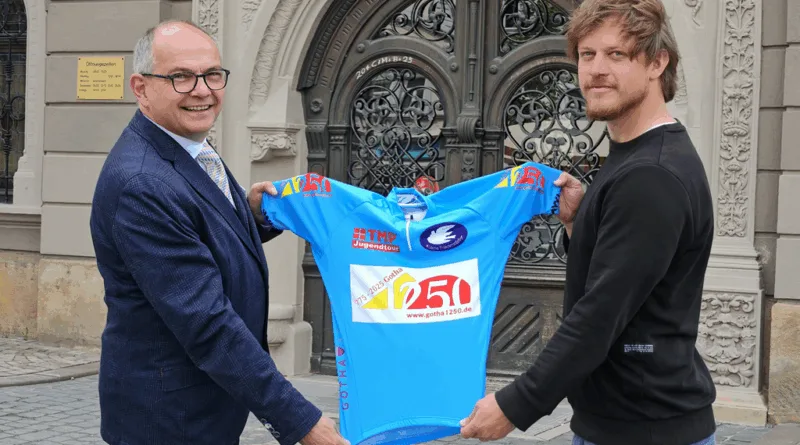 Oberbürgermeister Knut Kreuch und Markus Weise, Sachbearbeiter Sportförderung halten das blaue Wertungstrikot für den "Besten Thüringer". © Stadt Gotha
