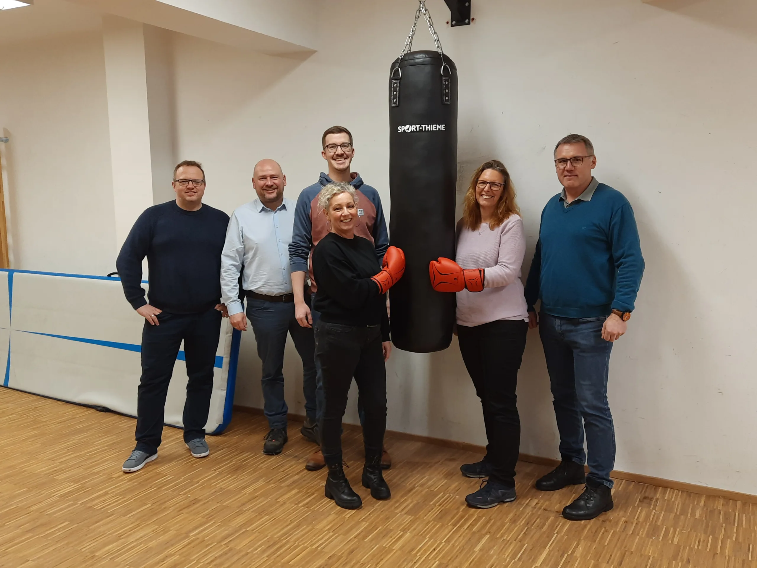 Nehmerqualitäten: Geschäftsführerin Ines Schellknecht (M., l.) und Kreistagsmitglied Sandy Frank (M., r.) testeten den neuen Boxsack aus, den Fraktionsvorsitzender Christian Jacob (r.), dessen Stellvertreter Lucas Gürtler (3. v. l.) sowie Florian Hofmann (l.) im Beisein des Kreisbeigeordneten Adrian Weber (2. v. l.) übergaben.